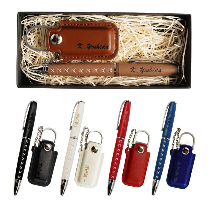 編み上げデザインの革巻きボールペンと、レザーカバー付きUSBメモリを組み合わせた名入れギフトセットです。