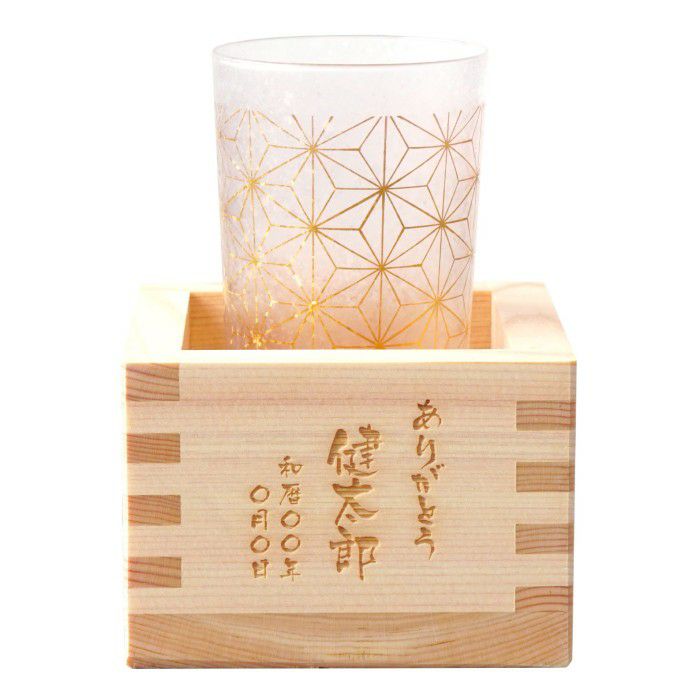 和の趣を纏ったグラスは、縁起の良い麻の葉模様。麻の葉は育ちが早く、生命力の強いことから、健康・成長を意味します。枡には企業名・ロゴ・メッセージなどの名入れ彫刻が可能。
