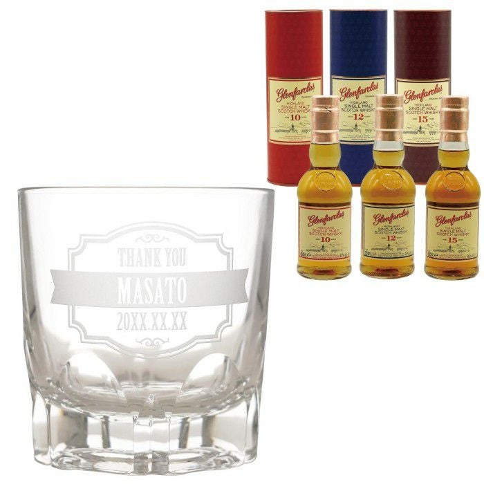 名入れ対応グラスと、スコットランドの名門蒸留所「グレンファークラス」の熟成年数違い3種(10・12・15年)をセットにした、特別感あふれるギフトセットです。