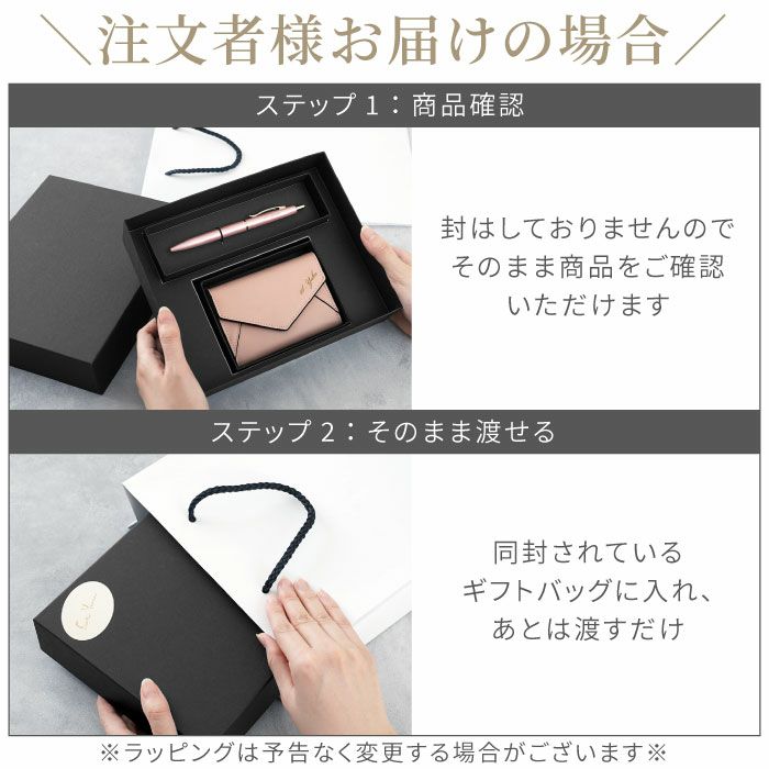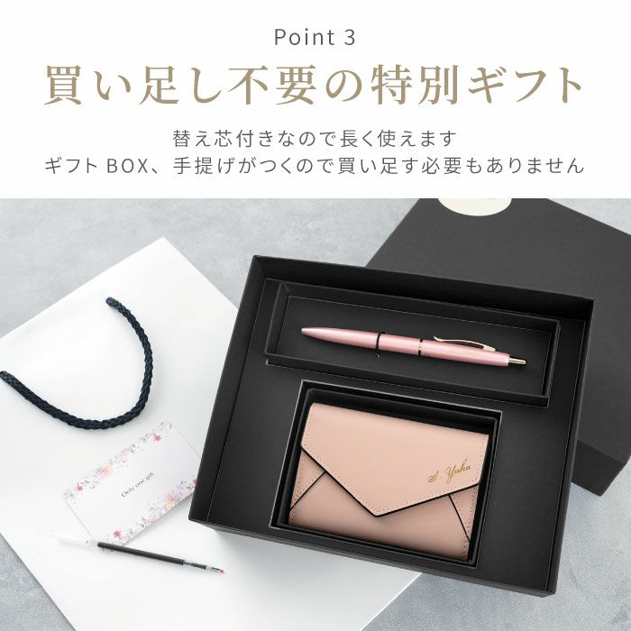 他の画像を見る フィラーレ ef×レター型名刺入れセット ¥ 9,980 税込 上品で洗練された「フィラーレ ef」ボールペンと、レター型名刺入れを組み合わせたギフトセットです。 ボールペンは軽やかな書き心地と細身のデザインで、長時間の筆記にも適しています。 名刺入れは本牛革製で、仕切りや外ポケット付きの高い収納力を備え、最大50枚の名刺を収納可能です。 専用ギフトボックスと手提げ袋が付属し、追加準備なくそのまま贈呈できます。 企業名やロゴの名入れにも対応し、創立記念や入社式、表彰、周年記念など法人需要にも最適です。 替え芯付きで長く愛用でき、贈る相手の印象を高めるワンランク上の記念品としてご利用いただけます。 詳細を見る お気に入りに登録する