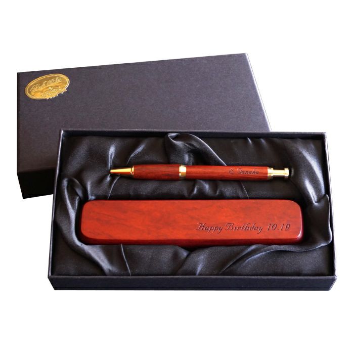 深みのある赤色と上品な光沢が魅力の天然紫檀(ローズウッド)を使用した、ノック式ボールペンと専用ペンケースのセットです。