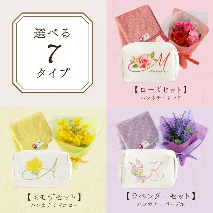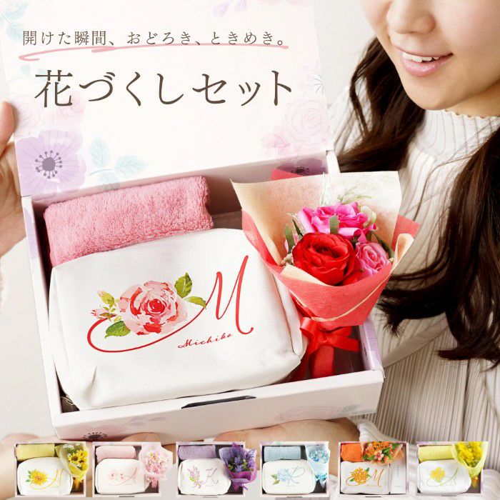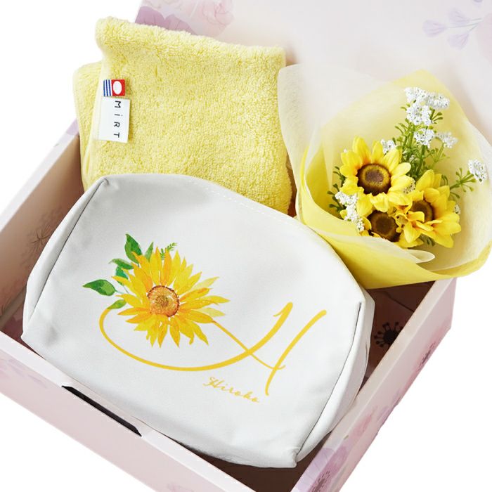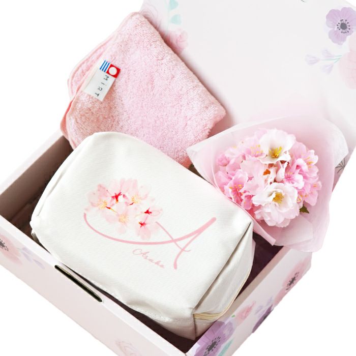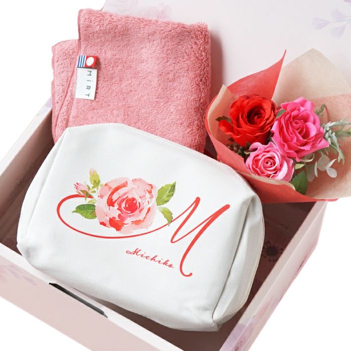 他の画像を見る イニシャルポーチ花づくしギフトセット ¥ 5,480 〜 ¥ 6,480 税込 ¥ 税込 華やかさと実用性を兼ね備えた「イニシャルポーチ花づくしギフトセット」です。 大容量ポーチは、メイク用品やガジェット、トラベルアイテムまで幅広く収納可能で、デスク上でも自立して使いやすい設計です。 イニシャルやお名前を組み合わせたオリジナルデザインは、記念品やノベルティにも最適です。 今治産のタオルハンカチは、上質な綿素材と程よい厚みで、日常使いはもちろん来客対応時にも上品さを演出。さらに、アートフラワーブーケを添えることで、長く楽しめる華やかさをプラスしました。 加えて、新たに【ハンドクリーム付き・キンモクセイセット】もご用意しました。 ポーチ・ハンカチ・ブーケに、金木犀の香りを再現したハンドクリームをプラス。心地よい香りと高い保湿力で、日常使いに華やかさと上質なケアを添える特別仕様です。法人様においては、周年記念や退職記念、成約記念の贈答品としてもご活用いただけます。 名入れや熨斗・ラッピングにも対応可能で、届いてすぐに贈呈できる点も魅力です。 女性社員やお取引先への感謝を伝えるギフトとして、ぜひご検討ください。 詳細を見る お気に入りに登録する